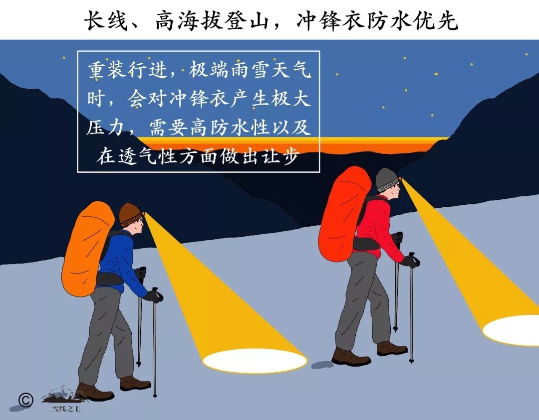 長(zhǎng)線重裝徒步、高海拔登山——這種活動(dòng)需要背負(fù)重裝包,極端雨雪天氣沖鋒衣有因背包壓力浸透的可能,從而帶來失溫風(fēng)險(xiǎn)。所以,此類活動(dòng)需要沖鋒衣具備高防水性,而在透氣性方面做出讓步,比如GORE-TEX Pro系列產(chǎn)品。