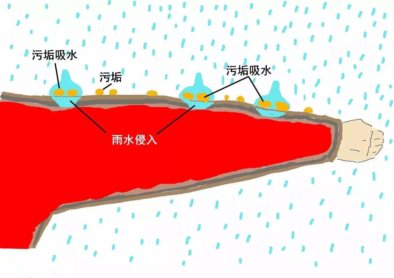 最初:涂層失效——污垢具有吸水的作用,衣服表面的污垢會(huì)給雨水可乘之機(jī)。