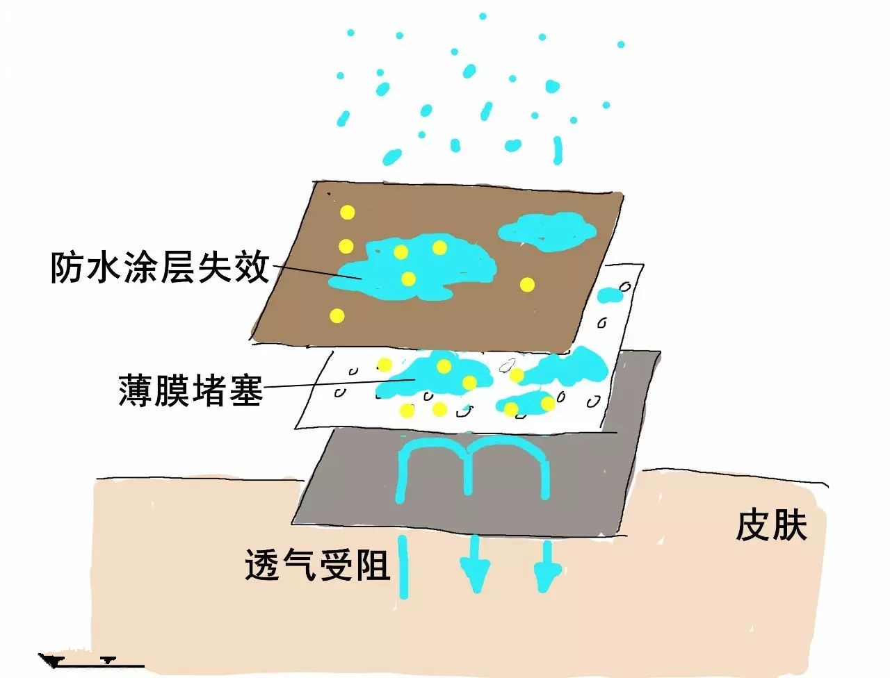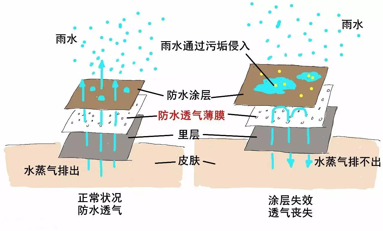 對(duì)有薄膜的沖鋒衣而言,如果污垢只是讓涂層失效,雨水并不會(huì)進(jìn)入身體,但涂層失效讓水蒸氣無法逃逸,透氣功能也就失效。