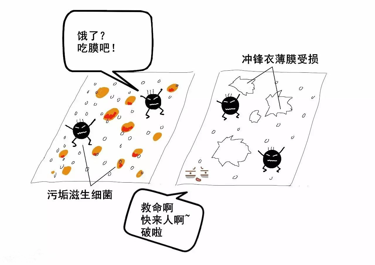 污垢侵入薄膜后,沖鋒衣防水透氣功能就完全喪失了。