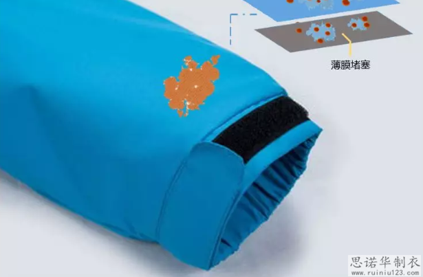 薄膜堵塞:當(dāng)污垢通過第一層保護(hù)層時,很容易開始侵入中間層的薄膜,薄膜被污垢堵塞。 這是整個保護(hù)系統(tǒng)的核心區(qū)域,夾克的防水透氣功能慢慢丟失!