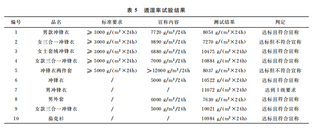 本文最終的判定是結(jié)合 GB/T32614—2016《戶外運(yùn)動(dòng)服裝 沖鋒衣》中面料功能性要求和產(chǎn)品銷售時(shí)的吊牌宣稱進(jìn)行。達(dá)標(biāo)是指符合沖鋒衣的合格品 標(biāo) 準(zhǔn) 要 求,反 之 則 不 符 合。10 件 樣 品中,只有5件達(dá)標(biāo),且只有3件是符合吊牌宣稱內(nèi)容。其中,標(biāo)示了 GB/T32614—2016的沖鋒衣,有3件達(dá)標(biāo),合格率為60%。近年來,監(jiān)管部門的抽查合格率一般在80%左右。這次比較試驗(yàn)合格率偏低的原因可能是樣品量較少,樣品的價(jià)格區(qū)間比較集中,且考核了接縫處的靜水壓。值得注意的是有2件沒有標(biāo)示 GB/T32614—2016的外套,其性能都符合標(biāo)準(zhǔn)要求。此外,銷售方對(duì)靜水壓的宣稱都偏高,有3件達(dá)標(biāo)了卻不符合自身的宣稱內(nèi)容。沖鋒衣 GB/T32614—2016標(biāo)準(zhǔn) 中 I級(jí) 對(duì) 靜 水 壓 的 要 求 也 只是:面料≥50kPa和面料接縫處≥50kPa,銷售 方卻往往宣稱100kPa,甚至達(dá)150kPa,而且也沒有充分考慮到面料接縫處?kù)o水壓值會(huì)相對(duì)偏小的現(xiàn)實(shí)。需要警 醒 的 是,5 件 標(biāo) 示 了 GB/T32614—2016的沖鋒衣其綜合宣傳都不符合規(guī)定,存在執(zhí)行標(biāo)準(zhǔn)標(biāo)注正確卻夸大宣傳的嫌疑。