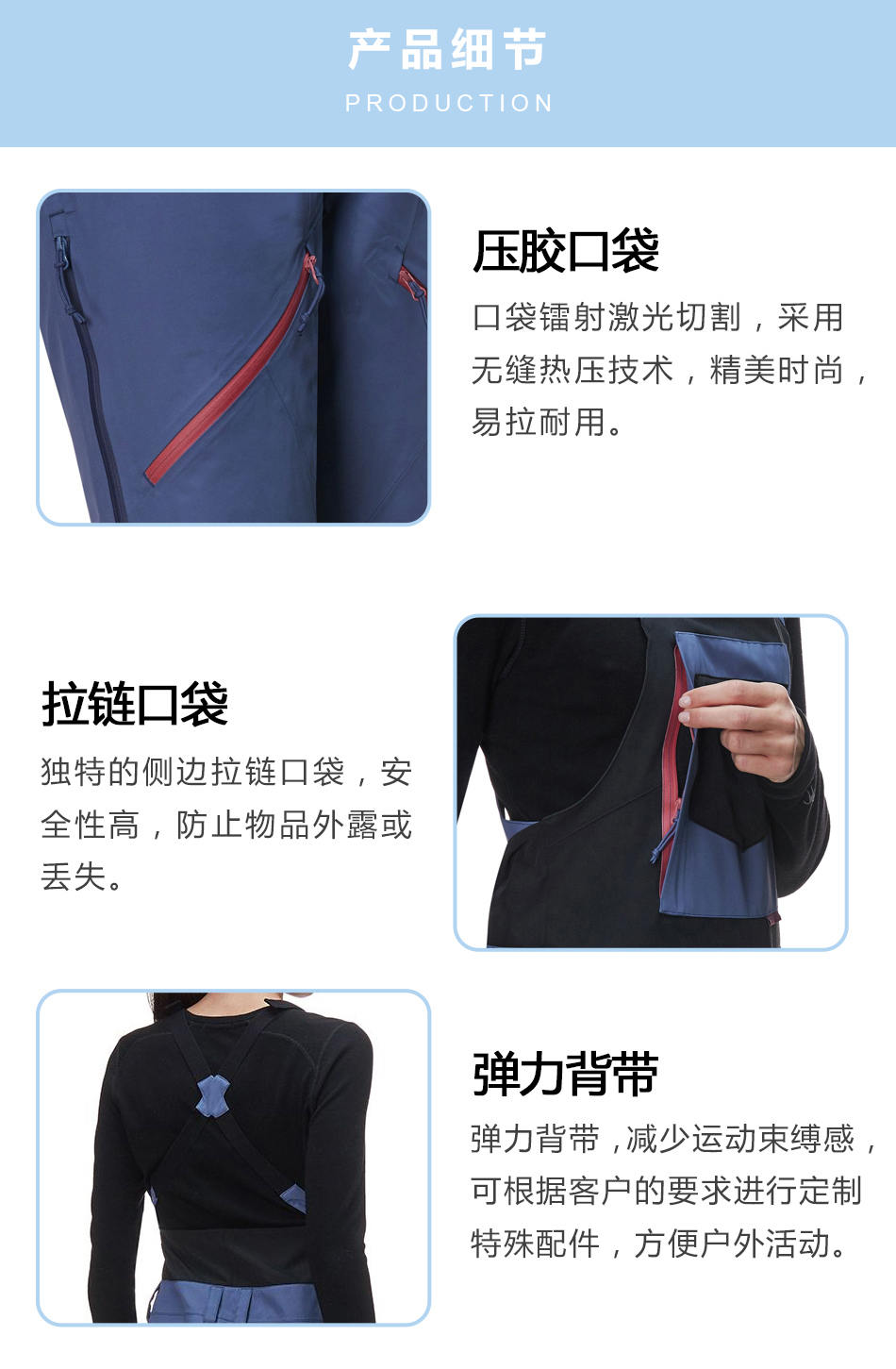 • 拉鏈口袋戶外滑雪褲生產(chǎn)獨特的側邊拉鏈口袋,安全性高,防止物品外露或丟失。