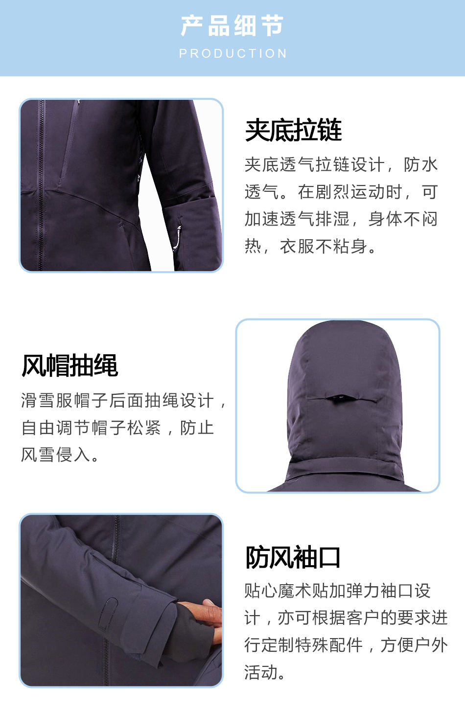 • 風(fēng)帽抽繩防水滑雪服定制出的帽子后面抽繩設(shè)計,自由調(diào)節(jié)帽子松緊,防止風(fēng)雪侵入。