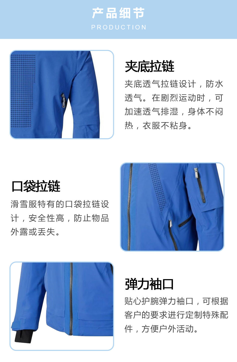 口袋拉鏈滑雪服生產(chǎn)特有的口袋拉鏈設(shè)計(jì),安全性高,防止物品外露或丟失。