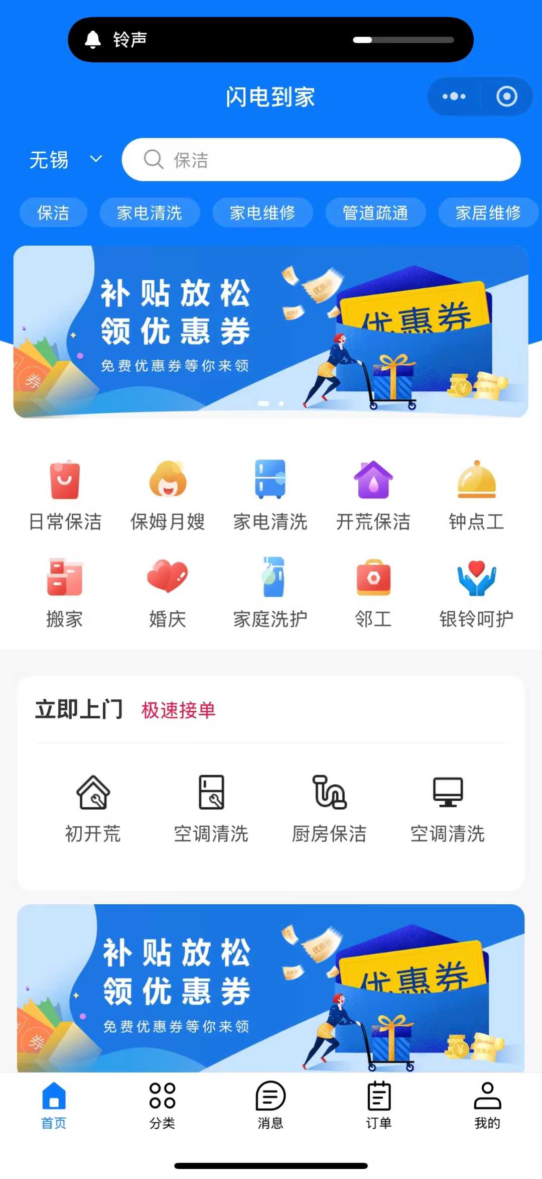 閃電到家是一款集日常保潔,保姆月嫂,家電清洗,家電維修,管道疏通,鐘點工,搬家,婚慶等多功能生活服務類小程序。